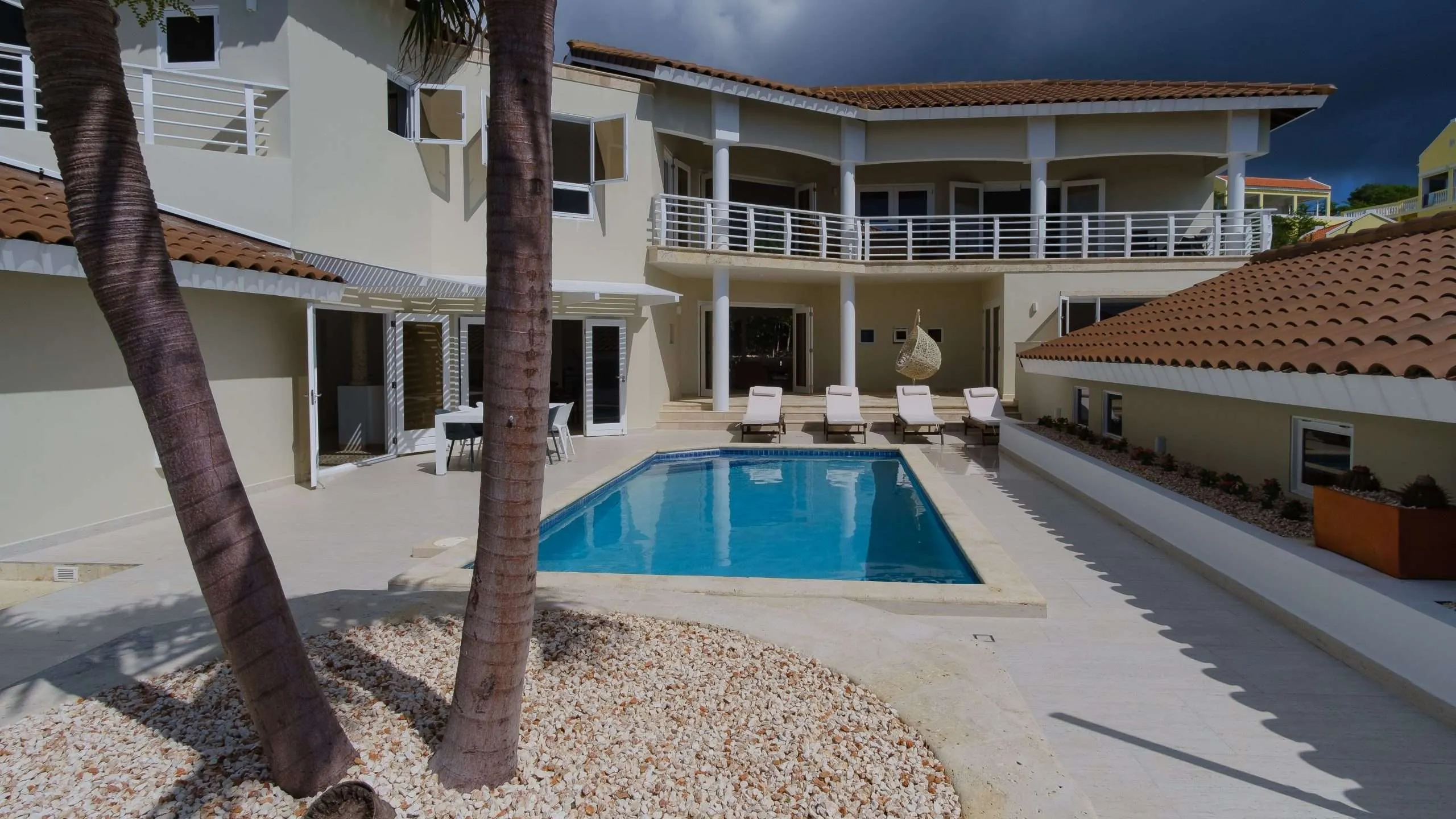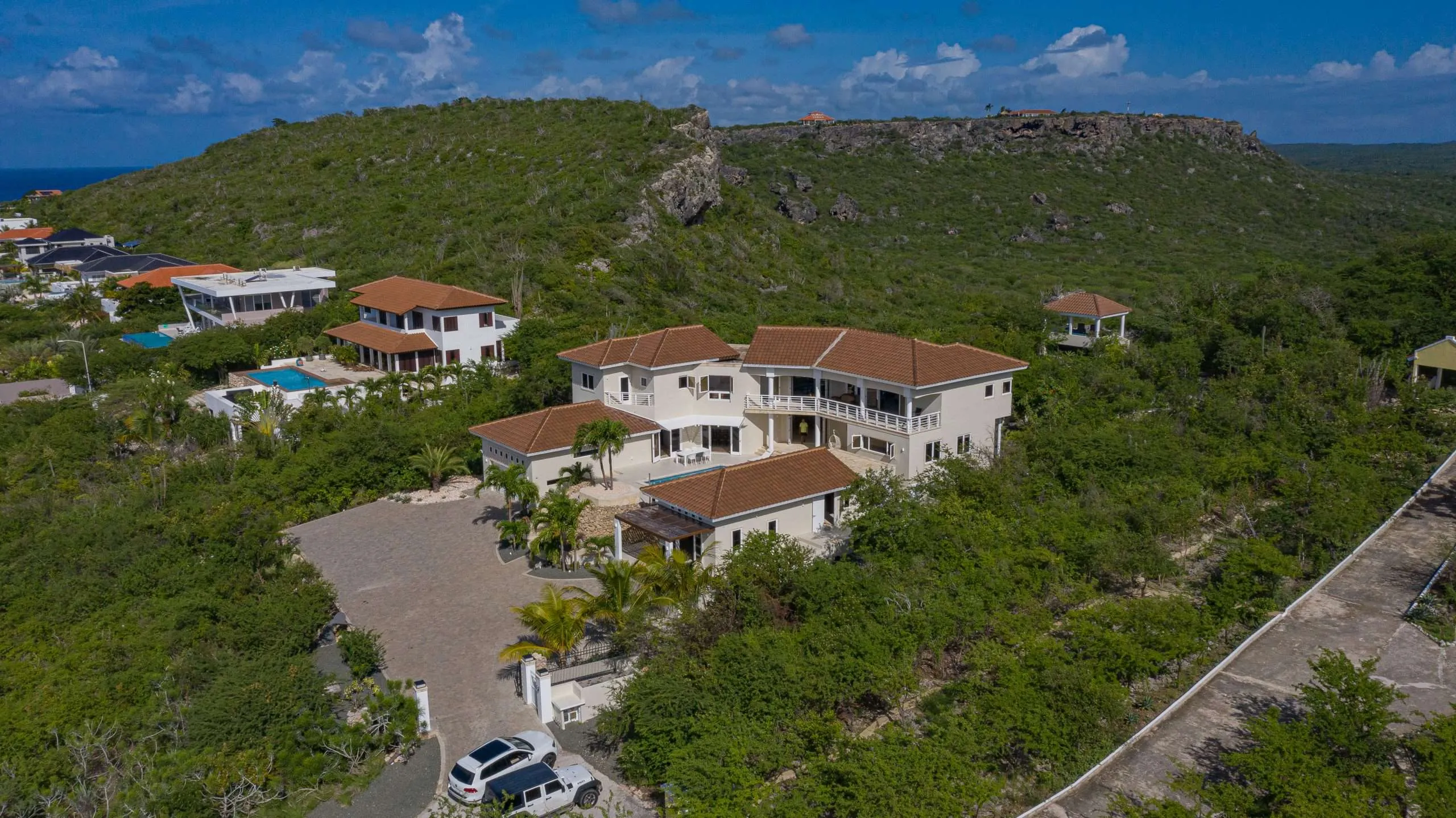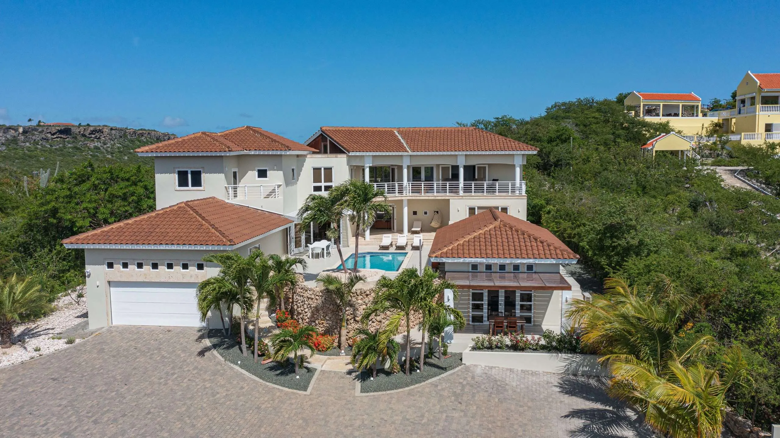 Villa 527 is a spacious and beautifully finished tropical family villa set within the prestigious Coral Estate Resort in Curaçao. With 764 m² of living space under roof, 7 bedrooms, 6.5 bathrooms, a separate guest apartment, and a private viewpoint overlooking the sea, this property offers an exceptional combination of comfort, character, and investment potential, accommodating up to 16 guests and delivering above-average rental returns. The villa is dressed throughout in travertine floors, both inside and on the generous terraces, giving every space a warm, resort-like feel. The heart of the home is a fully renovated, open-plan kitchen and living area, centered around a grand cooking island with breakfast bar, custom cabinetry, and premium appliances. Large French doors open directly onto the pool terrace, where palm trees frame an unobstructed view of the Caribbean Sea. Multiple shaded lounging areas, tropical planters, and ample space for sun beds make this terrace a destination in itself. The ground floor offers two guest bedrooms, one overlooking the tropical backyard and the other with direct patio access to the pool, plus a guest toilet and a separate laundry room. A central lounge connects the indoor living areas to both the front and rear terraces, creating a natural flow through the entire property. At the rear, a pergola-shaded outdoor kitchen and terrace offer a lush, private setting for evening dining surrounded by tropical gardens. A dedicated path leads to one of the villa's most remarkable features: a private concrete viewpoint lounge with a tiled roof, offering panoramic views over the inland lake of Rif St. Marie and the Caribbean Sea from three distinct vantage points, an unforgettable spot for morning coffee or sunset drinks. The upper floor houses the master bedroom suite with walk-in closet, double shower bathroom, and a private sea-view balcony overlooking Boca St. Michiel in the distance. Two additional guest bedrooms, each with a full private bathroom, and a spacious second lounge complete the upper level, with bamboo-finished ceilings adding a refined tropical touch throughout. The self-contained guest apartment, located beside the pool terrace, features 2 bedrooms, 2 bathrooms, a kitchenette, its own pergola terrace, and panoramic sea views, ideal for rental income, hosting family, or live-in staff. The villa also includes a double indoor garage with jet ski storage, a 29 m³ rainwater cistern with automatic garden irrigation, and fixed WiFi throughout the entire property including the pool terrace and viewpoint. Villa 527 is delivered fully furnished and is as good as new, a rare turnkey opportunity in one of Curaçao's most desirable resort communities.